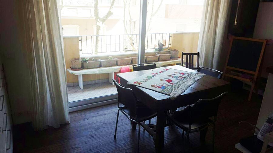 - Spazioso soggiorno con due divani a 3 posti, TV, tavolo da 8 posti, balcone per tutta la lunghezza dell’appartamento