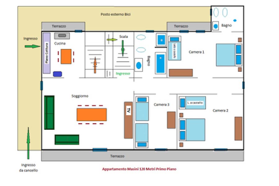 - 3 camere, una matrimoniale più un letto, una cameretta con due letti singoli e una cameretta con letto singolo. È inoltre possibile aggiungere nella matrimoniale un lettino da campeggio.