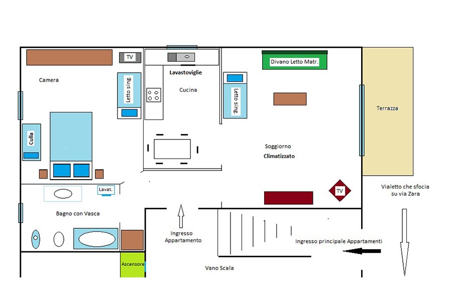 Situato al secondo piano di una palazzina con ascensore, a soli 50 metri da via Dante e 200 metri dal mare. È presente un'area all'ingresso dov'è possibile lasciare i passeggini.